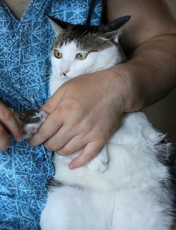 ▼但當他拿出指甲剪要準備動手時,貓咪突然瞪大眼,全身繃緊不肯就範...